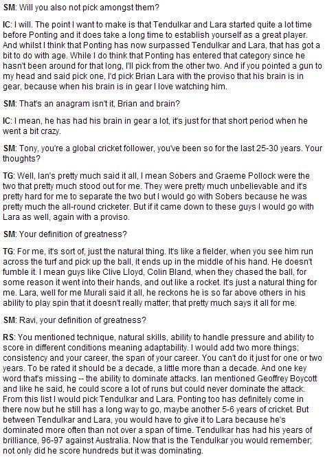 You can listen to the discussion of experts like sanjay manjrekar, Ravi sastri, Tony grieg, John wright . Every body said Lara is best amost the contemprories. Listen in this link http://content-usa.cricinfo.com/talk/content/multimedia/268727.html?alt=1;template=audioplayer Here is the small written form of the interview.
