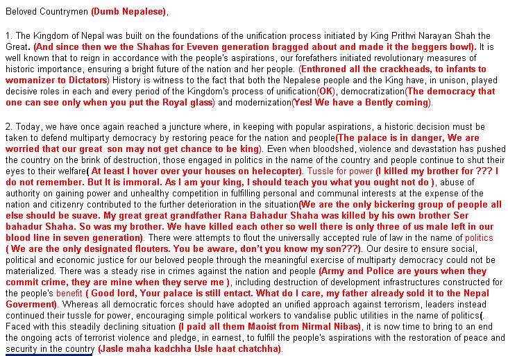 Ghar_jawai (joi-tingre) ji, You've said over and over again that you have NO obigation towards nepal and nepali people, why then do you force your opinion on the intrinsic matters of our nation? If you feel no responsibility towards the goodwill of the country then why support/oppose/comment on the actions of the king? As you put it 'This is not your business'. Are you doing so for entertainment purposes only? Do you just like to bark for no reason? Is this an attempt to display your intellectual capacity (or lack there of) by regergitating the opinions expressed by many others? As I've said before, unless you can provide a more feasible solution, why disregard someone else's attempt at a viable resolution? Your cynicism and unconstructive attitude is foolish and repulsive. Why so much negativity? Were you not hugged as a child?