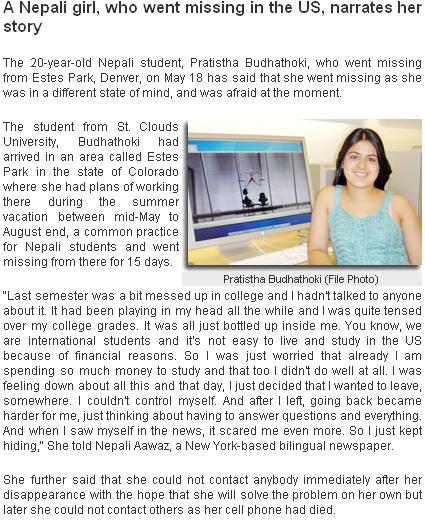 Bidhan, first of all I understand why you may think she's weird but I don't understand why you think she's scary. Second of all, we don't care what you think. The girl was going through some genuine problems and you come out here in Sajha and say " I think she's scary". What? Did she make you wet your pants? People like you make what you may call Boksees. Here is a message for you, take with a grain of salt---> don't say anything if you don't have anything positive/constructive to say. In life people strive for 3 things, career, money and scoial/family life. Poor girl had nothing going for her and she was going insane. I have been through exactly what she went through and I am pretty sure there are a lot of people that were on the same boat. There is always light through the tunnel. Pratistha Babe, I cracked a beer when I heard you were found. I was so happy. Call me!