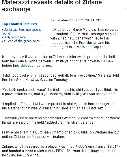 Materazzi told Gazzetta dello Sport that Zidane's sister was the subject.