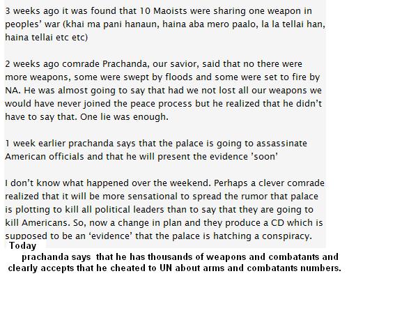When king made an apologetic speech on democracy day, nepali people went crazy about it, asking for him to be punished. Why don't the same people react when Prachanda makes such remarks? These remarks are more dangerous to our peace than the one from the king. Nepalese are all ball less. They shit in their pants when it comes to dealing with someone a bit tough but then when it comes to the king who has no power at all, they are all dadas. Reminds me of a saying "Oraloo lageko ko baagh lai, mirga ley pani hepcha."