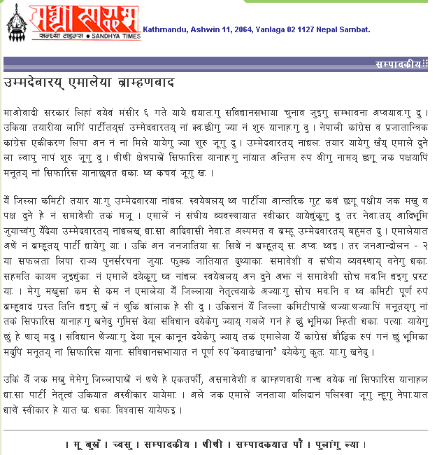 I think UML and all other parties will choose only bahuns... if that happenes, it will be too bad for Nepal and its future. In my heart, it's black and white... only newars should be nominated from the key areas on newars.. based on their population occupancy in those areas. I feel it that bahuns are taking it too far... i am afraid there will be soon backlash on bahuns in Nepal.. and I do not want to be victim of that.. please, bahuns... act sincerely, and with pure hearts as I do. You have to admit the wrongdoings and ill-intentions that is resident in our hearts. We cannot rule all the time... it's a viscious cycle.. if bahuns rule now, soon they will finsihed and other guys will take over.. this is not what we want for Nepal.. we call want to live happily with unity. The best thing bahuns can do for nepal is, for time being, all bahun leaders should quit politics. That's the best solution I can see.