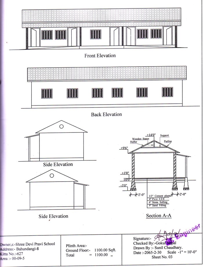 pkr_boston I sincerely hope that you are making some "blueprints" for your project. In the mean time, Help Nepal recieved a proposal that may suit your interest and I am hoping you will get involved in this. I have some details and photographs of the school that needs a repair. Project Proposal Template Sri Devi Lower Secondary School Description of project: Sri Devi Lower Secondary School is located in Bahaundanda , ward No 7 , Jhapa District. The school was established in B.S.2026, with support from local social worker, Intellectuals, School Management Committee. The school is now almost deteriorated and needs to be renovated immediately. The total population of the VDC is 4000, Out of 500 School going aged children in this area, just 143 children study in this school with the remarkable number of the students from marginalized and ethnic groups. The predominant community members of which are illiterate as well as marginalised. Bahundanda -8,Jhapa is the boarder of Nepal and India. Most of the youth migrate towards India in search of job and other opportunities. Hence most people of the village involve only women and children. 7 school staffs are working in the lower secondary school for the welfare of this school and community including the principal. The other nearby schools are one secondary school is approximately 5 km ,lower secondary school running classes from one to seven is 6 km and a primary school which runs the classed from one to five only is 4 km distant from the focussed school. Project Aims/Goals: The aim of the school is to renovate and to construct a school building of approximately 1100 sq ft. and provide the service seekers a quality education. Delivery timelines The project shall be initiate within the 15 days from the fund transfer. The project shall be completed with in 6 months from the starting date of the construction. Participants/stakeholders The School Management and Construction Committee, the teachers, guardians, staffs of the schools, VDC, community. Project Management Details The school management committee (SMC) and the construction committee has the responsibility to manage the construction materials and the management committee will seek for donation/contribution both local and outside. This will include giving applications to different organizations to notify of their financial requests. Project Delivery Methodology A construction committee (SCC) has been formed by the school with a purpose to complete the construction related task in systematic manner. The committee is entirely responsible for the construction of the new building. Monitoring and Evaluation will be done by the School Management Committee, District Education Office, Jhapa, District Development Committee, Jhapa, and HELP NEPAL Network. Background on key members/ key agencies Members | Designation/Status | Mr. Kuber Guragain | Principal of the school Member Secretary SMC | Mr. Lal Bahadur Magar | President of the SMC | Mr. Lila Bahadur Saru | Member - SMC | Mr. Tek Bahadur Magar | Member - SMC | Ms Gopi Maya Rai | Member - SMC | Mr .Ganesh Bahadur BK | Member - SMC | Mr. Shyam Tamang | Member - SMC | Mr Krishna Prasad Sharma | Teacher | Ms Manju Moktan | Teacher | Mr Krishna Prasad chhetry. | Teacher | Project related statistics The total estimated cost for the construction is NRS 7500,000 (rupees seven lakh Fifty Thousnd only). The school management committee has managed to get labour support, resources, and from the VDC worth 200, 000 (rupees two lakh) locally. The local labour work includes transportation of the construction materials to the school free of cost, collecting of construction materials, and helping in the building construction HeNN contribution is expected to be around NRS 400,000( Four lakh rupees) - Exact amount can be sketched only after receipt of the proposal) Funding and resources The Management committee has managed to utilize the local resources as local labour, resources from the community forest, and the donation fund from the VDC worth Rs 2 lakh, out of 7 lakhs 50 Thousand Nepalese Currency. Financial and labour contribution is sought from local individuals.Local organizations as well as other organization shall also be asked for the donation .Help Nepal Network has been asked for NRs 4 lakhs for the construction of the building. Previous such projects None of the other organization has helped the school till date.
