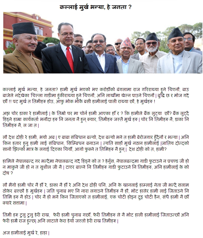 NOTE: The opinions here represent the opinions of the individual posters, and not of Sajha.com. It is not possible for sajha.com to monitor all the postings, since sajha.com merely seeks to provide a cyber location for discussing ideas and concerns related to Nepal and the Nepalis. Please send an email to admin@sajha.com using a valid email address if you want any posting to be considered for deletion. Your request will be handled on a one to one basis. Sajha.com is a service please don't abuse it. - Thanks.